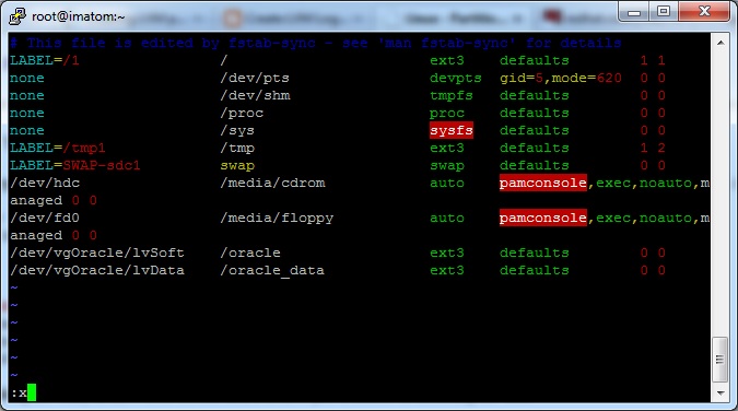 -Modificamos el archivo de particiones /dev/fstab con el comando vi y agrego las 2 ultimas lineas que muestro en la imagen.